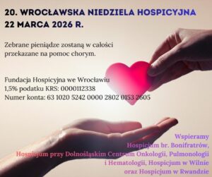 Nasi wolontariusze 22 marca 2026 r. będą kwestować pod kościołami wrocławskich i wybranych podwrocławskich parafii. Z góry dziękujemy wszystkim, którzy zechcą wesprzeć chorych objętych opieką hospicjów prowadzonych przez Dolnośląskie Centrum Onkologii, Pulmunologii i Hematologii oraz Konwent Bonifratrów.